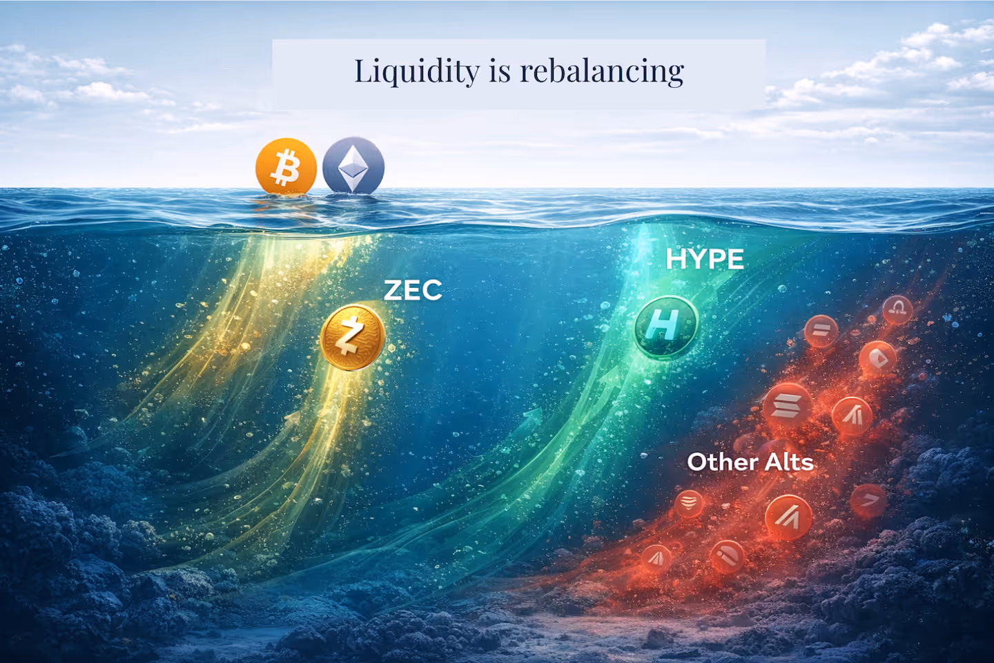 Liquidity is concentrating as altcoins weaken and select tokens outperform.